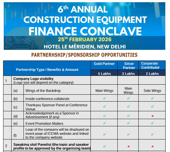 The 6th CE Finance Conclave with the theme: “Building a Resilient Infrastructure and Construction Equipment Financing Ecosystem” aims to bring together key stakeholders from the infrastructure and construction equipment ecosystem—including OEMs, developers, banks, NBFCs, insurance companies, fintech companies, policy makers, multilateral agencies, and global & Indian experts. The event will provide a platform to deliberate on the current CE financing landscape, identify critical challenges, and explore innovative, technology-driven solutions to strengthen India’s financial ecosystem.